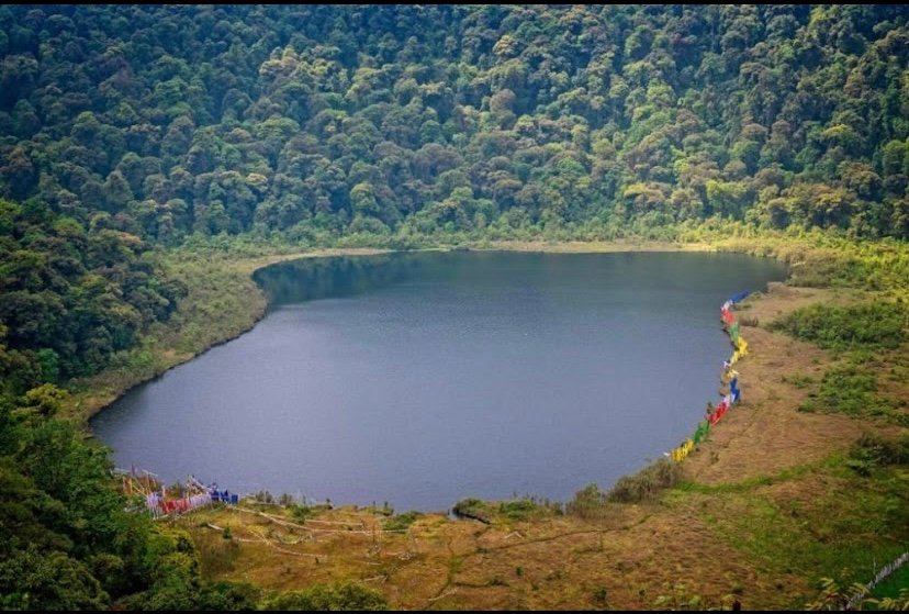 Tranquil lake in forested surrounds, a popular pilgrimage site for Buddhists and Hindus.
