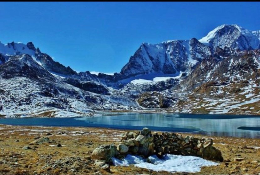 Freshwater lake on a 19,460-ft plateau topped up by glacial waters with a mountain backdrop.